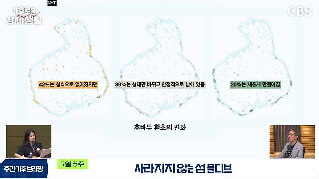 그래서 몰디브를 좀 제대로 관찰해 보자 이렇게 해서 기후 전문 기자 레이몬드 정, 그다음에 사진작가 제이슨 글레이라는 이 2명이 2주 동안 몰디브에서 전문가들이랑 같이 지내면서 좀 심층 취재를 했다고 해요. 몰디브 소멸 위기가 한창이던 1990년대 중반부터 이제 최근까지 촬영한 항공사진이랑 위성사진을 좀 비교를 했대요.