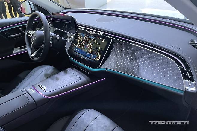 디지털화는 신형 E클래스의 핵심 요소다. 기본으로 적용된 커다란 헤드업 디스플레이(HUD)는 전자식 계기판보다 많은 정보를 전한다. E300 AMG 라인에는 기본, 익스클루시브에서는 옵션 사양인 조수석 대시보드의 슈퍼스크린은 주행이 시작되면 운전석에서는 안보인다.