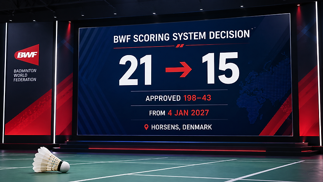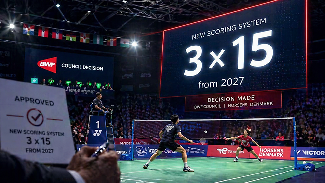 세계배드민턴연맹 BWF는 25일 덴마크 호르센스에서 열린 총회에서 새 점수제를 승인했다. 표결 결과는 찬성 198표, 반대 43표였다. 이에 따라 2027년 1월 4일부터 국제 배드민턴은 기존 21점 3게임제에서 15점 3게임제로 바뀐다.