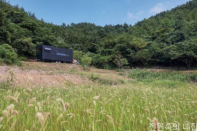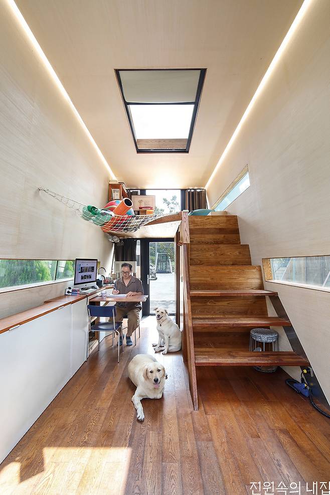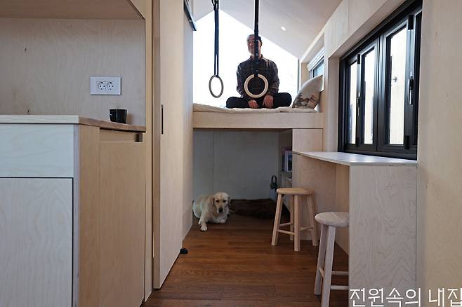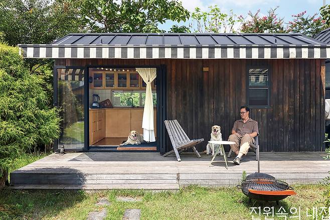 오지에 설치한 정박형 바퀴 달린 집은 부부와 반려견들이 함께 하는 아지트가 되었다.