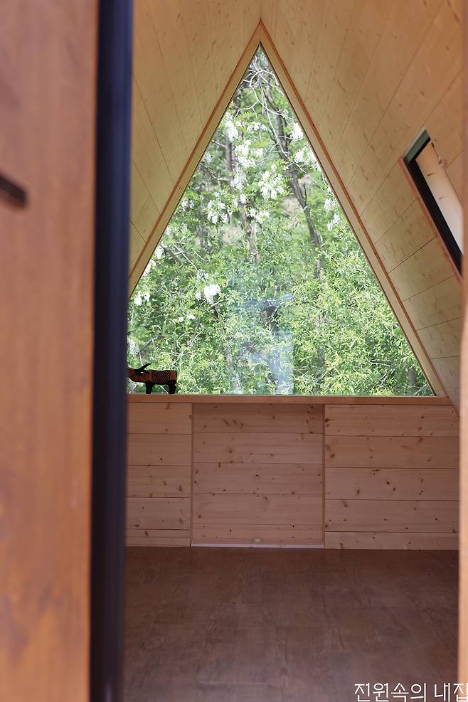 4평 규모의 세모집은 동화 속 오두막 같은 외관이 특징이다. 별채, 창고, 농막, 관리동 등 다용도로 사용할 수 있다. 넓은 삼각창은 자연 풍경을 가득 받아들여 작은 면적이지만 개방감을 느끼도록 한다.