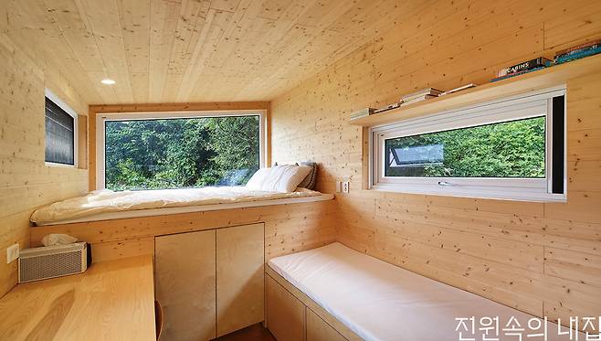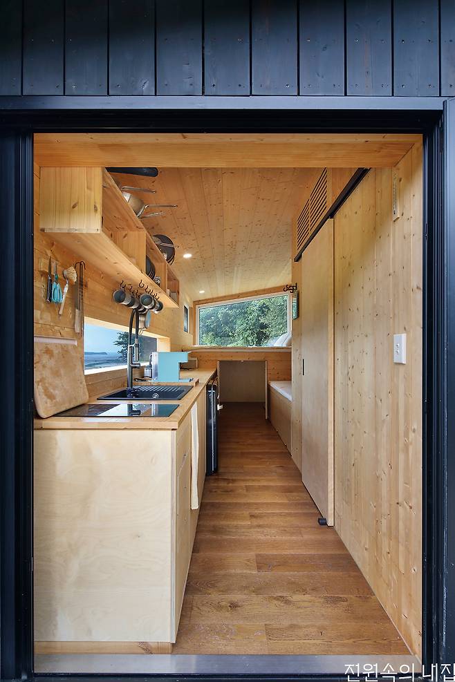 6평 규모의 슬로우캐빈은 2층 침대 같은 다락, 천장에 달린 필라테스 스트링, 아이들이 특히 좋아하는 동굴같은 벙커, 줄을 직접 잡아당기는 형태의 아날로그 욕실 조명 스위치 등 재미있는 요소들을 더했다. 입구의 깊은 처마와 동선을 고려한 설계로 실용도 역시 높다.