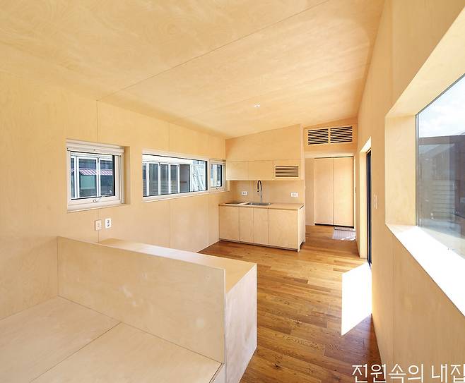 농촌체류형 쉼터의 허용 범위인 연면적 33㎡ 내에서 건축이 가능한 9평 규모의 슬로우캐빈. 마룸은 같은 면적이라도 어떻게 하면 더 넓고 쾌적하게 만들 수 있을까에 대한 끊임없는 연구개발을 통해 집의 집적도를 높여 공간에 깊이를 담아냈다. 창문의 위치, 출입문의 방향, 수납공간의 활용 등을 모두 고려해 슬로우캐빈 9를 탄생시켰다. 이 집은 현관, 전실, 욕실에만 3평을 할애했으며 유리파티션으로 샤워 공간만 습식으로 분리하고, 나머지는 온돌난방이 가능한 건식으로 마감했다.
