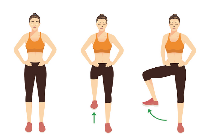➁ 오른쪽 무릎을 천천히 들어 올려 무릎이 직각을 이루도록 한다. 이때 무릎과 골반의 높이가 같도록 자세를 유지한다.