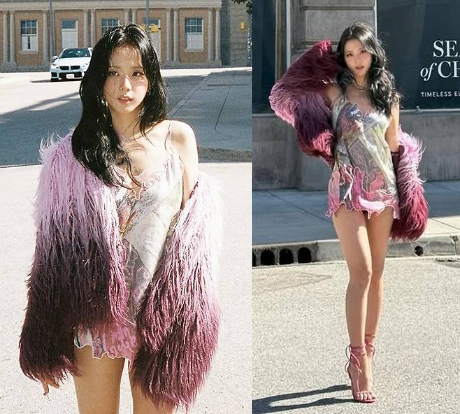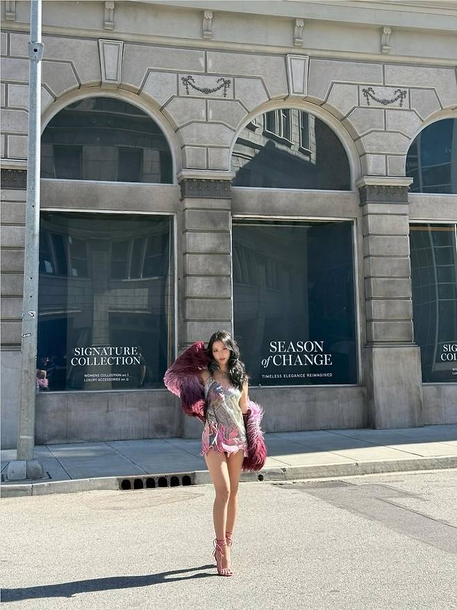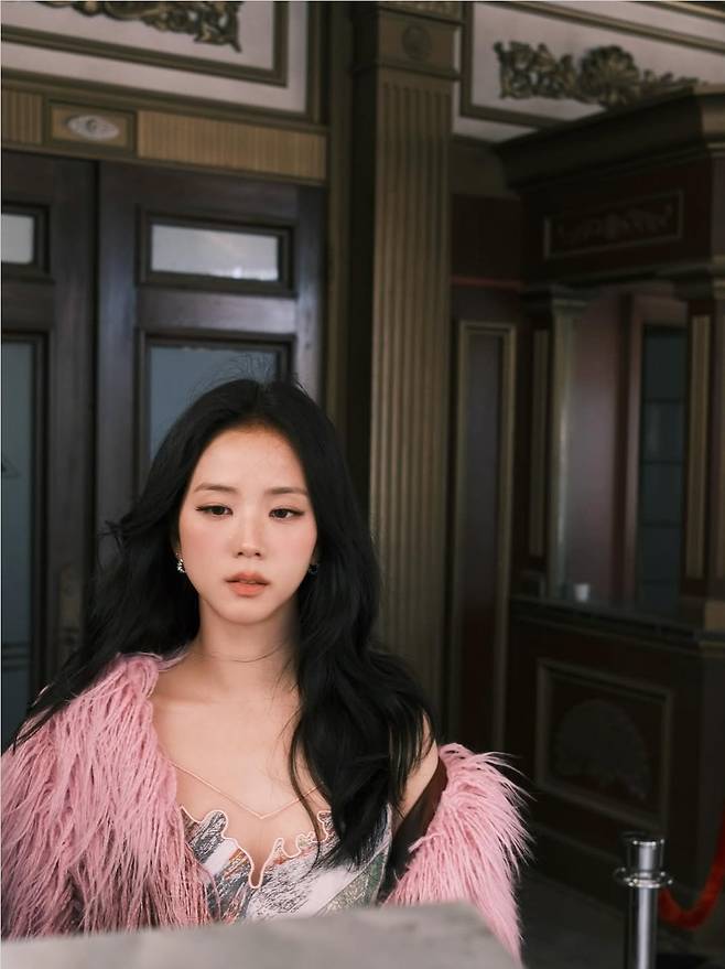 마치 영화 세트장을 연상케 하는 고풍스러운 건물 앞에서 지수는 빈티지한 슬립 드레스를 입고 등장해 도시의 풍경을 몽환적인 분위기로 바꿨습니다.