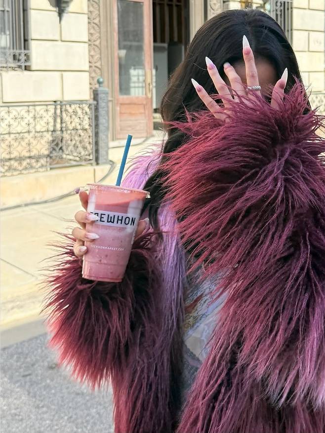 레이스 트리밍과 그래픽 패턴이 어우러진 슬립 드레스는 그녀의 소녀미와 도회적인 매력을 동시에 끌어올렸고, 여기에 붉은빛과 핑크가 그러데이션 된 인조 퍼 코트를 걸쳐 보헤미안 무드를 가미했습니다.