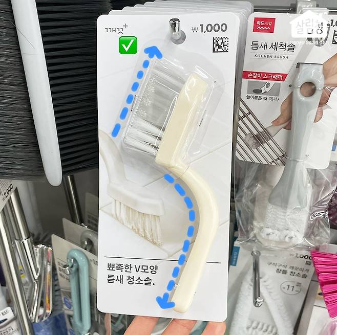 첫 번째 다이소 추천템은 바로 '뾰족한 V모양 틈새청소솔'인데요. 솔끝이 날카롭게 되어 있어서 타일이나 샤워부스 틈새의 물때를 제거하기 좋더라고요. 심지어 손에 무리가 가지 않도록 손잡이 부분을 휘게 만든 디테일까지..? 1000원이라는 가격이 안 믿기는 퀄리티였어요.