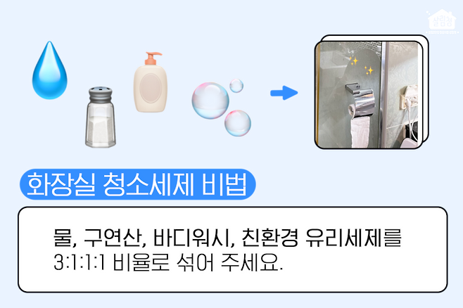 집에 흔하게 있는 재료인 물, 구연산, 바디워시, 친환경 유리세제를 3: 1: 1: 1 비율로 섞어주는 것 ✔️ 이렇게 만든 화장실 청소세제를 강력한 압축 분무기에 담아 뿌린 뒤 10분 정도를 놔둔 후 수세미로 닦아주면 화장실이 몰라보게 깨끗해진다고 하네요.