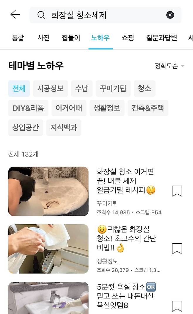 먼저 노하우를 찾아 이것저것 검색해 봤어요. '화장실 물때 제거 방법' '화장실 청소솔'.. 하루 종일 검색창만 들여다본 결과 운이 좋게 꿀팁이 모여있는 사이트 하나를 발견했답니다. 그 이름은 바로, 오늘의집! 인테리어 사이트인 줄로만 알았는데 살림 노하우도 이렇게나 많았네요.