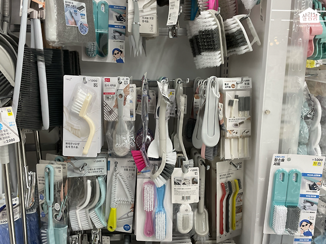 찾았다 다이소 화장실 청소솔 코너! 수많은 제품이 있어서 헷갈리지만, 얇고 긴 청소솔만 찾으면 됩니다 👀