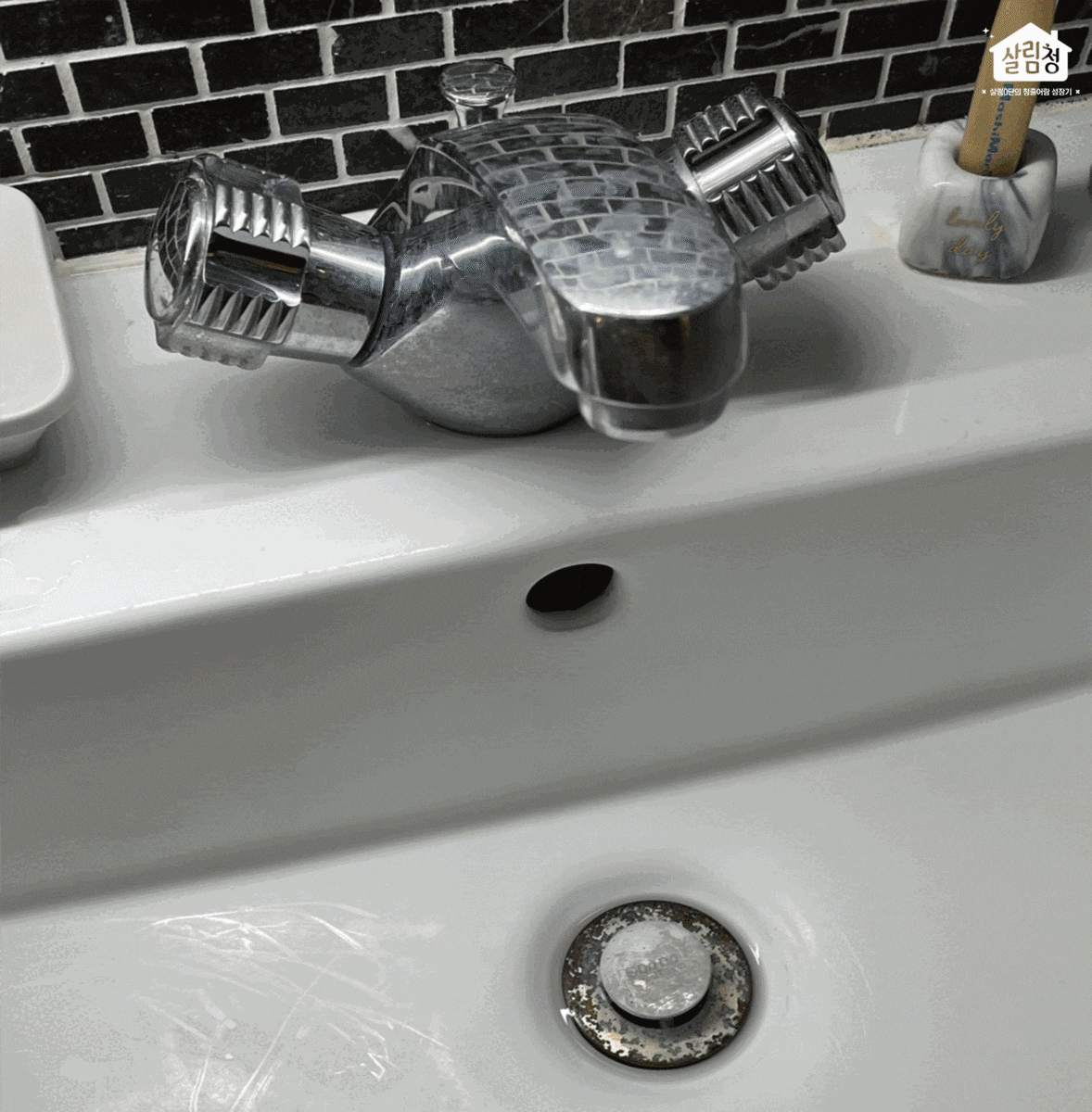 자세히 보다가 발견한 두 번째 문제점. 세면대, 세면대 수전, 화장실 바닥 사이사이에 물때가 많더라고요. 흠, 틈새를 청소할 수 있는 도구가 필요할 것 같아요.