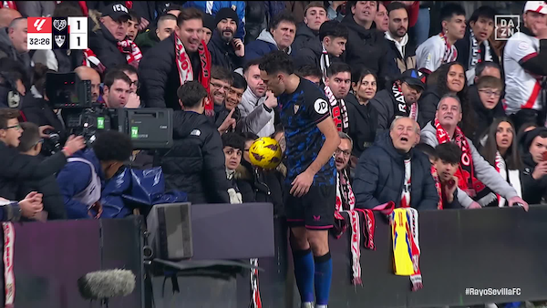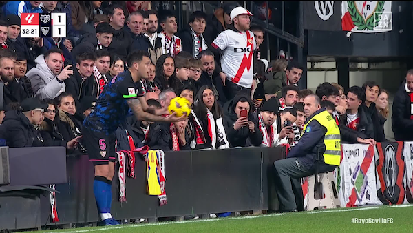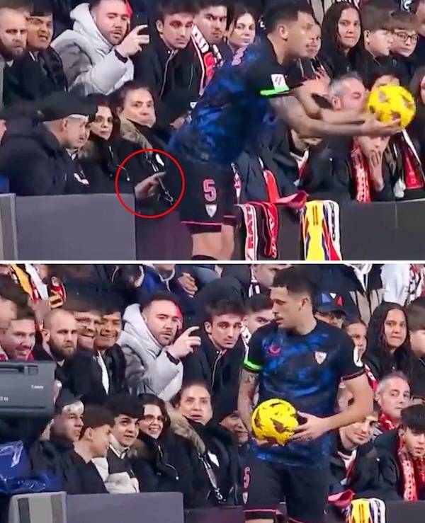 경기 중 믿을 수 없는 장면이 포착됐다. 전반 33분 세비야 루카스 오캄포스가 스로인을 하기 위해 관중석 쪽으로 붙었다.