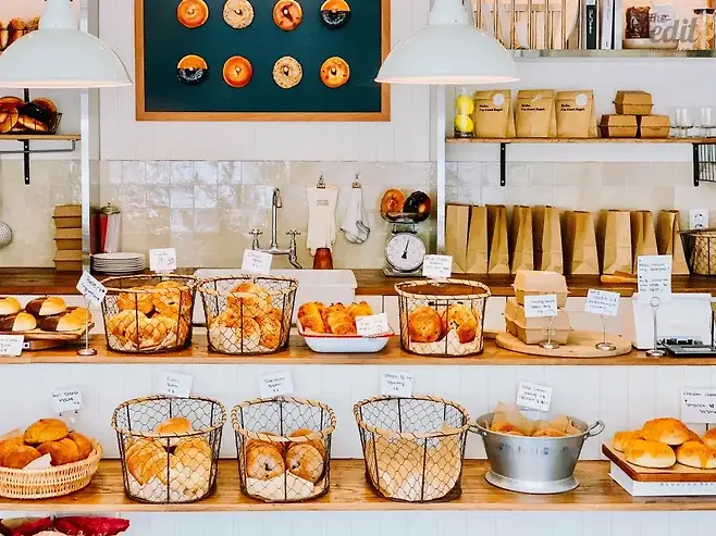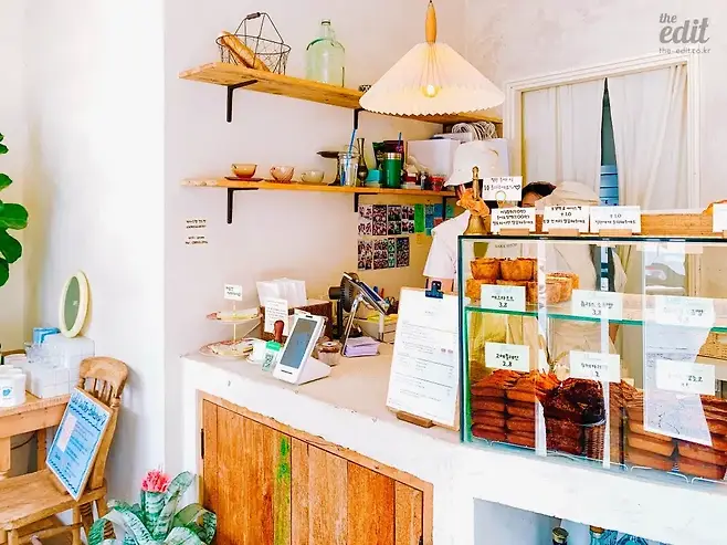 아이보리 톤의 우아한 인테리어가 아늑함을 더하고, 각종 빵들이 아름답게 진열되어 있어 마치 유럽의 한 카페에 들어온 듯한 분위기를 완성한다.