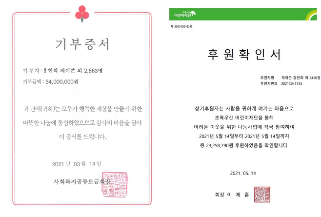 뿐만 아닙니다. 두 사람은 매년 결혼기념일마다 기부하며 사랑의 의미를 되새기고 있는데요. 매년 결혼기념일인 10월 21에 1,021만 원의 금액을 기부하고 있습니다. 지난해에는 아들 준범군도 기부에 동참하기도 했었지요.
