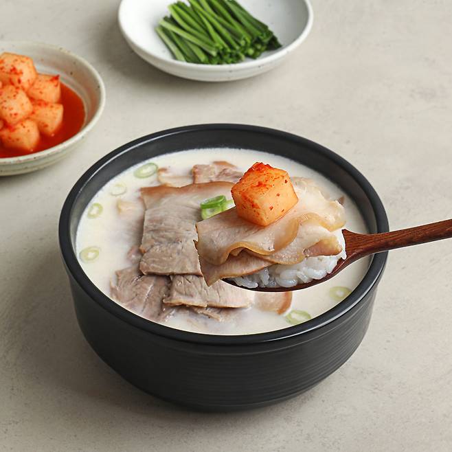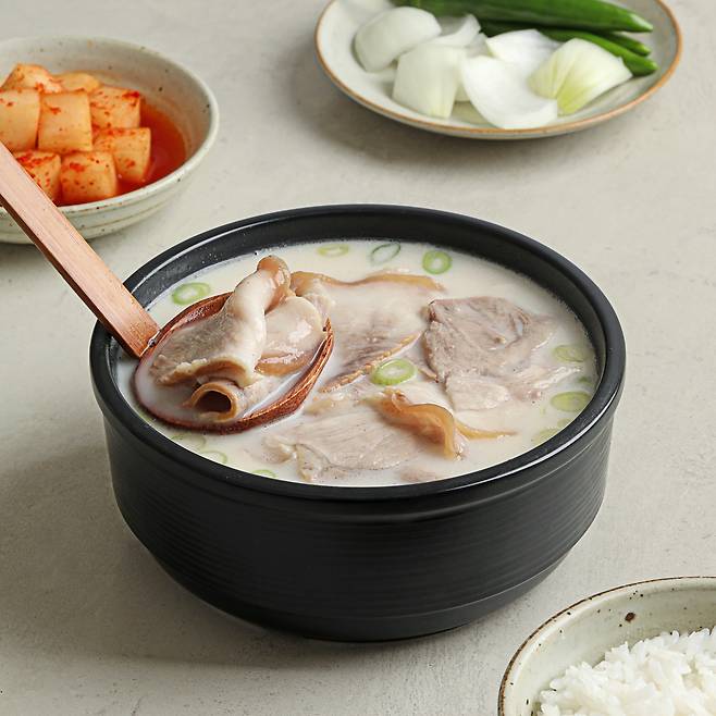 그렇지만, 단백질 함량 높은 돼지고기를 주재료했을 뿐만 아니라 삶은 살코기와 여러 영양성분이 골고루 포함된 사골국물이 들어있어, 조금만 먹어도 포만감이 크다는 장점을 가지고 있지요. 한끼 식사로 굉장히 든든해요.