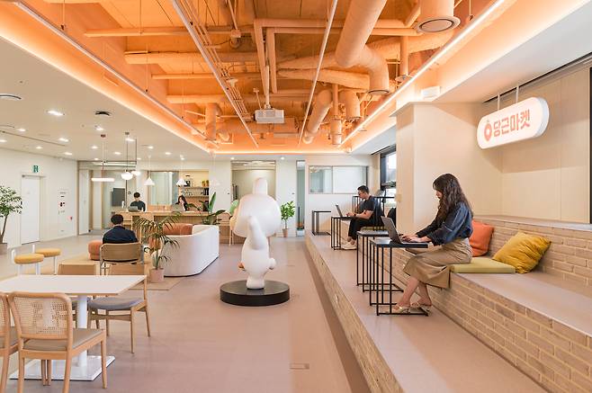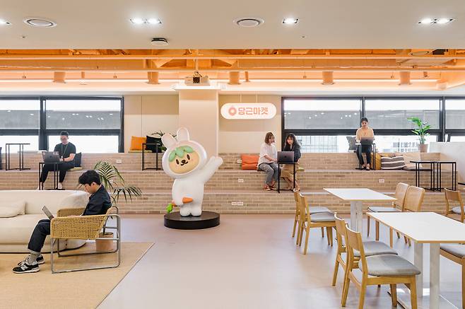 11층에 올라가면 당근마켓의 트레이드마크, 당근이가 반겨주는데요. 당근이 주위에는 휴게를 위한, 혹은 자유로운 근무를 위한 메인 라운지가 있습니다. 이 공간은 직원들이 스몰 토크로 구성원들 간 정서적이면서도 생산적인 관계가 이어지도록 돕기도 하고, 사무실에서 근무하다 장소를 옮겨 리프레시를 할 수 있는 공간이 되기도 한다네요.