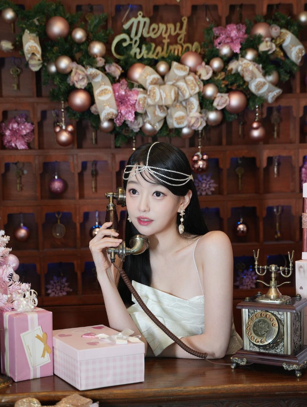 강아랑은 하이넥에 리본으로 허리를 강조한 드레스로 청초한 분위기를 자아내고 있다.