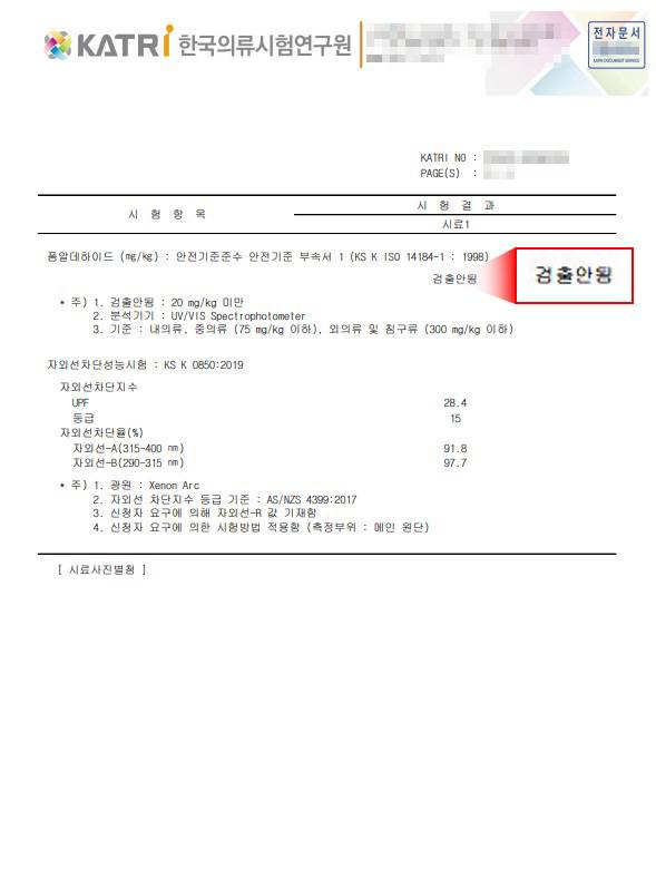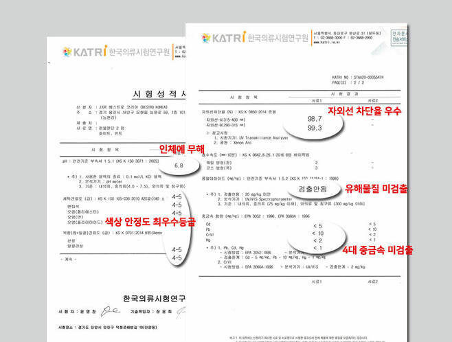 한국의류시험연구원에서 인증 받은
