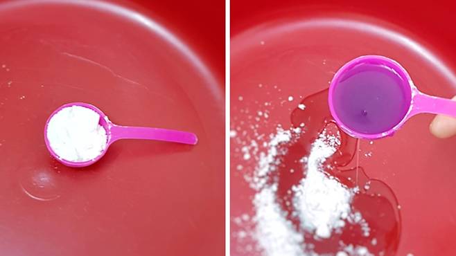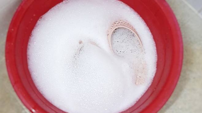 이럴 땐 베이킹소다 1스푼과 빨래에 사용하는 전용세제를 2스푼 정도 넣어 주세요. 그리고 뜨끈뜨끈한 물을 부어 잘 섞으세요.