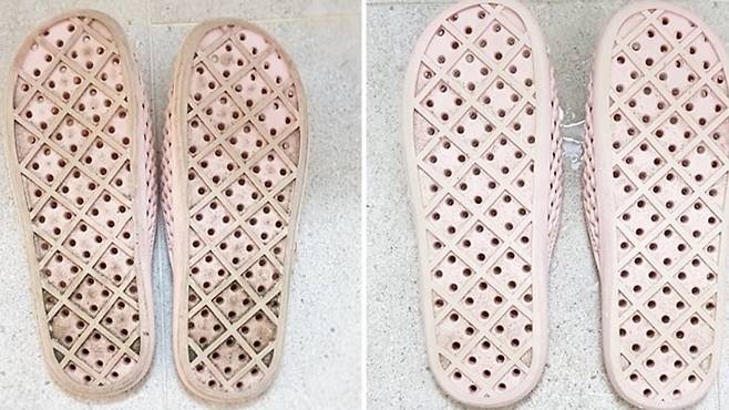 한번 전후를 비교해 보세요. 왼쪽은 전으로 곳곳에 곰팡이와 물때가 쉽게 보여요. 하지만 청소 후엔 아주 깨끗해진 욕실화를 보실 수 있답니다.
