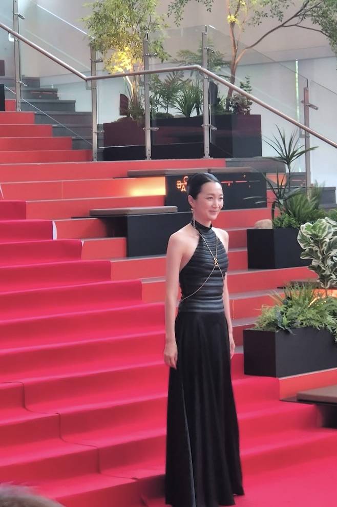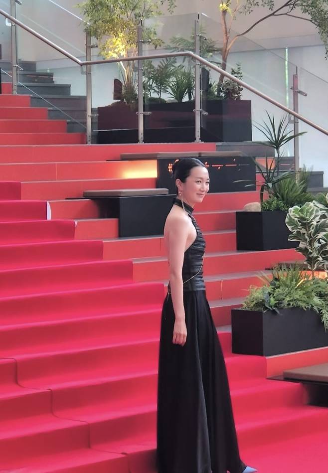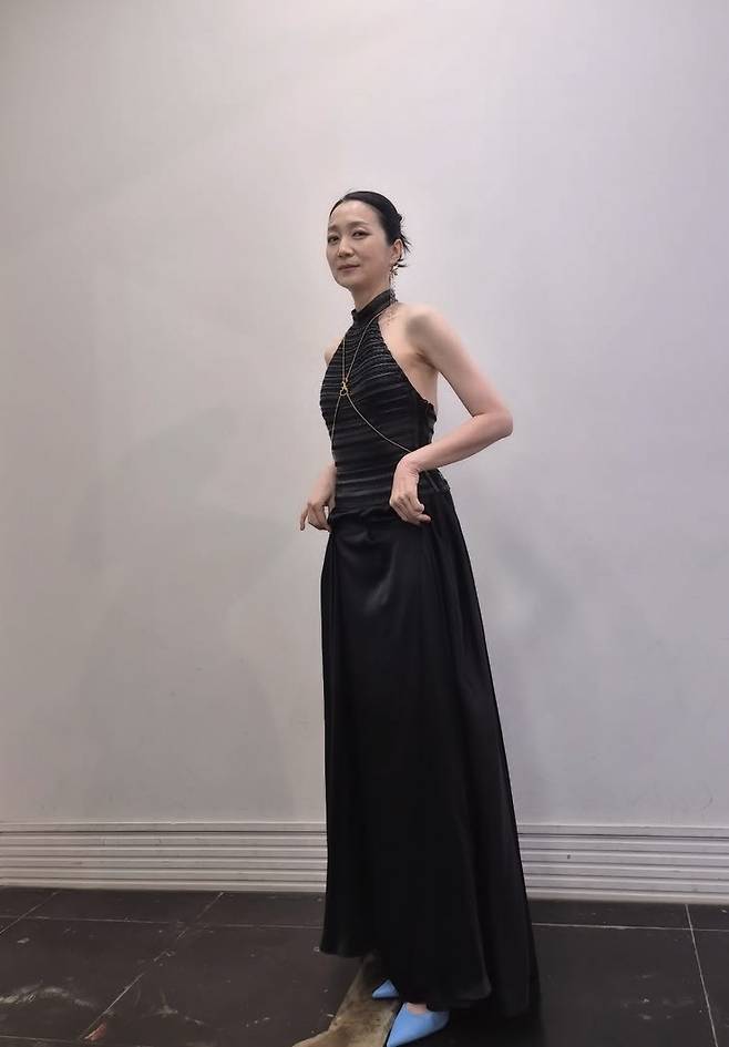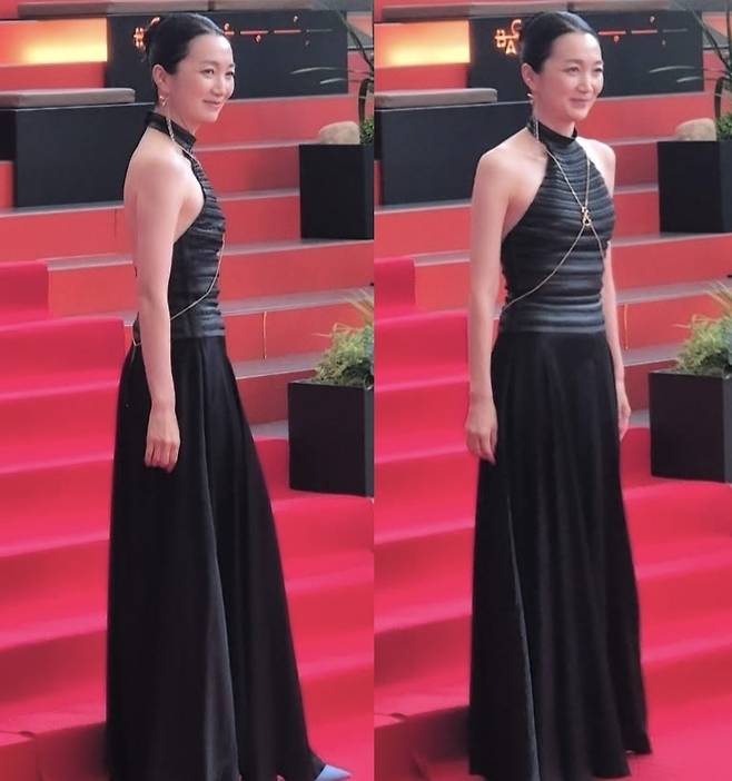 블랙 홀터넥 드레스를 착용해 레드카펫에 걸맞은 우아한 무드를 연출했습니다. 상체는 슬림하게 잡아주고 하체는 플레어로 떨어져 균형 잡힌 실루엣을 강조했습니다.