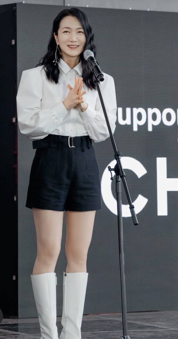 헤어는 단정한 올림머리로 연출해 목선과 어깨 라인을 드러냈습니다. 군더더기 없는 스타일링으로 드레스의 강렬한 존재감을 더욱 부각했습니다.