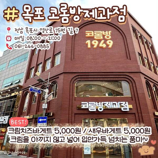 70년이 넘는 역사를 자랑하는 곳으로써 목포에 들른다면 꼭 가봐야 할 장소인데요. 목포 코롬방제과는 전국 5대 빵집 중 하나로 특히, 새우바게트와 크림치즈바게트는 많은 사랑을 받고 있는 대표메뉴입니다.