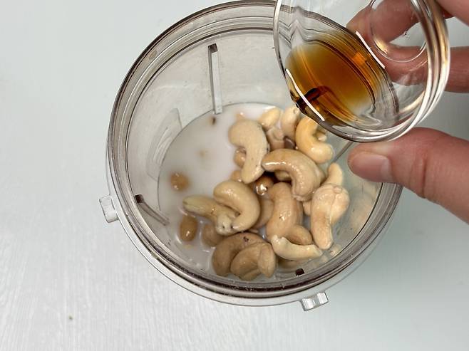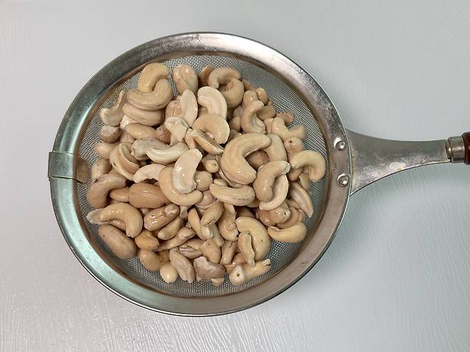 1. 캐슈넛을 큰 그릇에 넣은 다음 끓는 물 3컵을 넣고 뜨거운 물에 약 1시간 동안 담가둔다. 또는 캐슈넛을 실온의 물에 하룻밤 담가둔다. 요리를 시작하기 전, 캐슈넛은 반드시 물기를 뺀다.