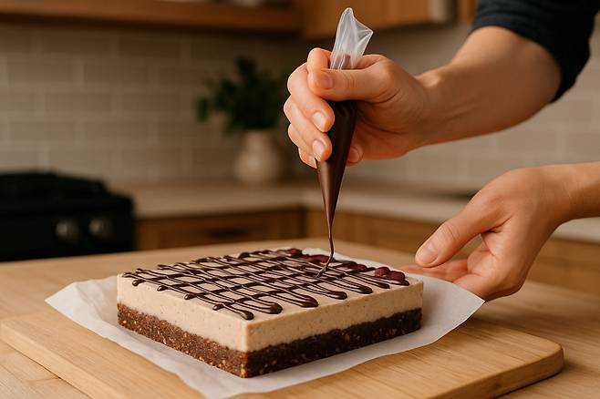 8. 냉동실에 4~6시간 동안 넣어 굳힌다. 바 형태로 자른다.