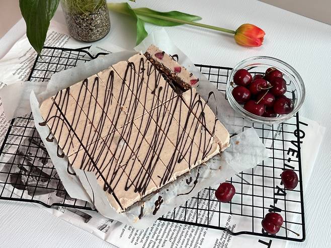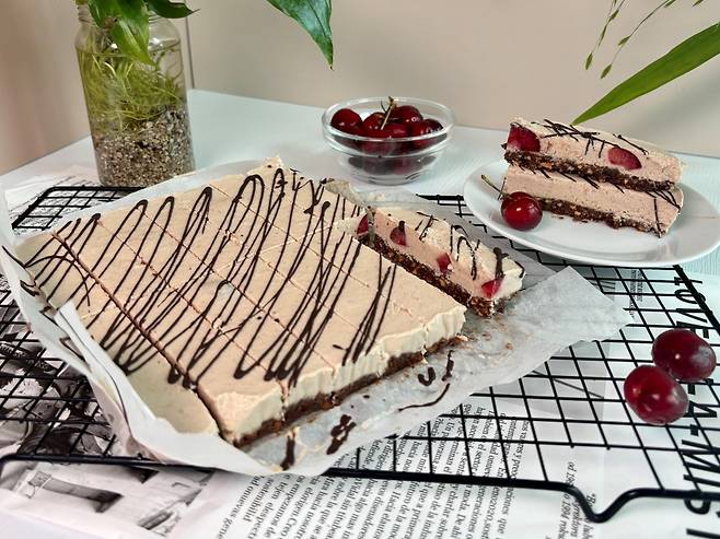 건강한 체리를 활용한 리얼푸드 레시피는 ‘비건 체리 치즈케이크 바’입니다. 유제품을 배제한 비건(vegan, 완전채식) 간식이라 비건인이나 식물성 식품을 선호한다면 제격입니다. 또 오븐을 사용하지 않기 때문에 여름철 만들기도 수월합니다.