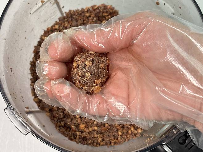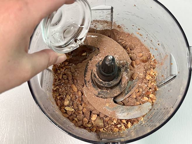 3. 푸드 프로세서 그릇에 대추야자와 아몬드를 넣고 덩어리가 될 때까지 돌린 후, 코코아 가루, 코코넛 오일, 천일염을 넣는다.