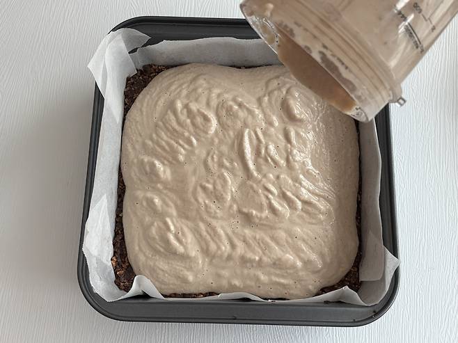 4. 혼합물이 공 모양으로 약간 뭉칠 때까지 다시 섞는다. 준비된 사각팬에 혼합물을 넣고 고르게 눌러 크러스트를 만든다.