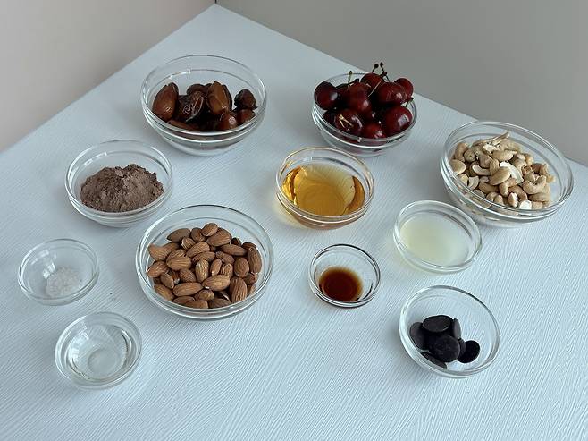 필링: 생캐슈넛 1과 ½컵, 메이플시럽 1/3컵, 바닐라 엑스트렉 1작은술, 코코넛밀크 ½컵, 체리 1과 ½컵(씨 빼고 반으로 잘라 준비), 레몬즙 2큰술