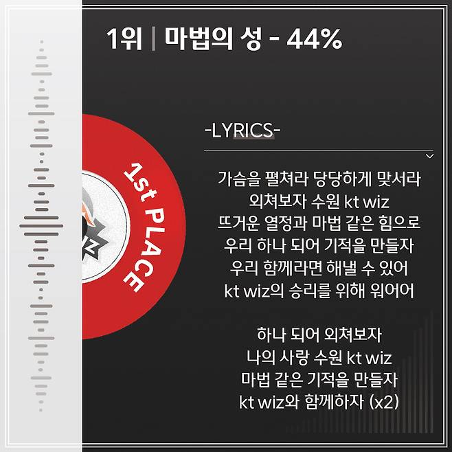 KBO리그의 막내지만 21시즌 통합우승을 달성하며 큰 반향을 일으킨 KT 위즈. 창단 초기 최하위권에 머물던 암흑기를 지나 이제 막 전성기가 시작됐다. 그리고 그들의 곁엔 무한한 열정이 흘러넘치는 ‘주일매직’ 김주일 응원단장을 필두로 마법사들의 승리를 위한 주문을 외는 팬들이 있다. 기세를 몰아 당당한 강팀으로 우뚝 서고자 하는 염원이 통했는지 올 시즌도 상위권을 기록하며 승승장구하는 위즈. 마법 같은 돌풍을 만드는 그들의 응원가 중 팬들의 가장 많은 지지를 받은 곡은 무엇일지 아래에서 공개한다. ‘수리수리 마수리’라는 옛날 옛적의 주문은 이제 잊자. 요즘 KBO리그에서 유행하는 마법의 주문은 ‘승리하라 수원 KT 위즈여’니까!