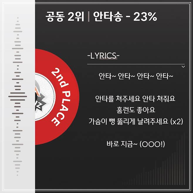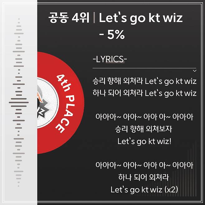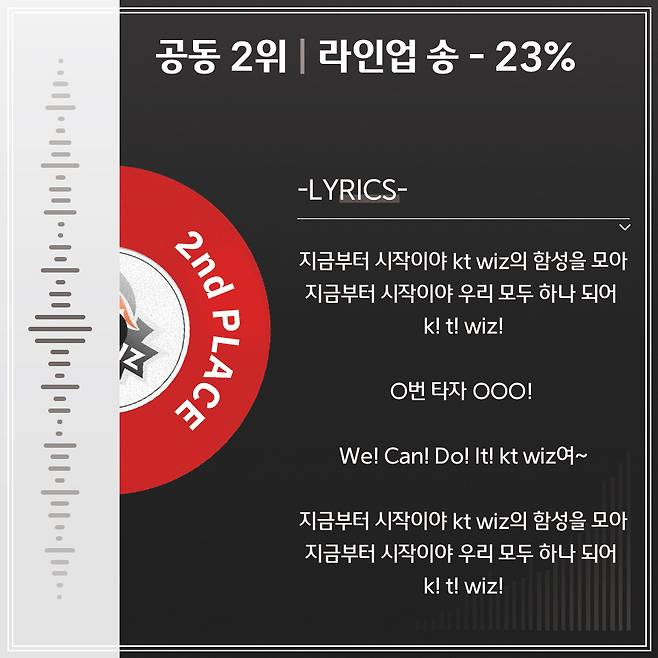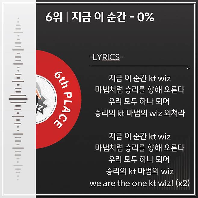 많은 이에게 잘 알려진 뮤지컬 '지킬 앤 하이드'의 OST ‘This is the moment(지금 이 순간)’가 원곡이다. 자주 들어본 멜로디기에 누구나 가사만 알면 곧장 따라 부르기 쉬운 응원가이자, 경기에서 승리했을 때 응원단상에서 터져 나오는 축포를 보며 부르는 승리가다. 승리를 한 바로 지금, 이 순간에 다들 한 마음으로 KT의 승리를 축하하자는 노랫말을 담았다. 뮤지컬 곡이 원곡이다 보니 음이 좀 높긴 하지만 부르다 보면 가슴이 저절로 벅차오르곤 한다. 그러나 안타깝게도 이번 투표에선 다른 후보들에 밀려 한 표도 득표하지 못하며 6위를 기록했다.