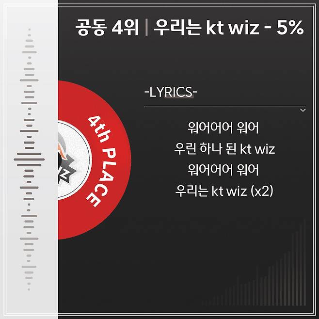 마법사 군단의 귀여운 응원 메들리 사이에도 웅장하고 비장한 떼창곡이 이따금 등장하곤 한다. 공동 4위를 차지한 ‘Let's go kt wiz’는 2000년대 초 선풍적 인기를 끈 드라마 ‘야인시대’의 OST인 ‘나 사나이다’란 강렬한 곡을 사용해 만들어졌다. 팀 창단 초기부터 불렸으며, 마치 중요한 승부에 임할 때 결의를 다지는 듯 깊은 비장미가 느껴지는 노래다. 도입부는 낮은 저음으로 부르지만 ‘아아아~’라고 외치며 시작되는 후렴구에선 음이 급격히 높아진다. 드넓은 그라운드를 향해 목청껏 후렴구를 부르면서 가슴이 뻥 뚫리는 기분을 다 같이 느껴보자.