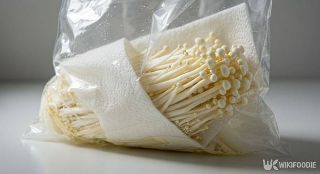 냉장 보관 시 팽이버섯을 비닐 팩에 넣고, 키친타월을 함께 넣으면 수분이 조절돼 신선도가 더 오래 유지된다.