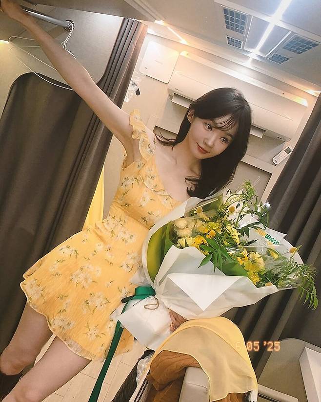 그녀가 선택한 옐로우 컬러 원피스는 작고 섬세한 꽃무늬와 프릴 디테일이 특징으로, 쇄골과 어깨 라인을 자연스럽게 드러내며 우아한 실루엣을 완성한다. 잘록한 허리 라인이 강조된 디자인은 전체적인 바디 밸런스를 극대화하며, 밝은 톤의 옐로우 컬러가 여름 바다의 햇살과 어우러져 화사함을 배가시킨다.