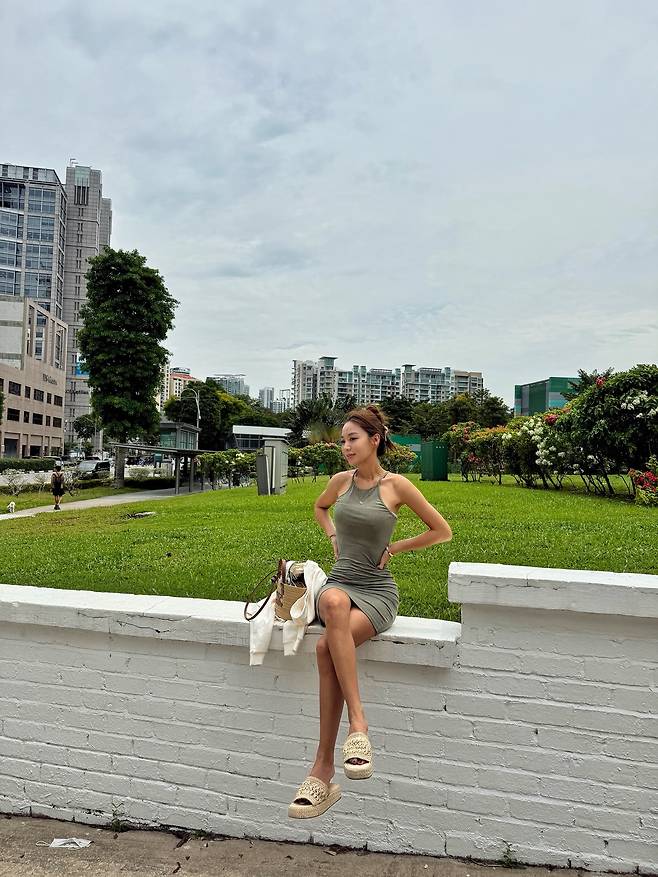 고풍스러운 유럽풍 건축물을 배경으로, 몸에 밀착되는 카키 컬러의 홀터넥 미니 원피스를 선택해 탄탄한 어깨 라인과 슬림한 실루엣을 가감 없이 드러냈는데요.