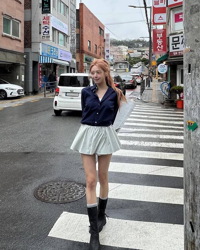 유나가 선택한 스타일은 격식을 갖추면서도 캐주얼한 매력을 동시에 보여주는 룩이다. 버튼을 자연스럽게 풀어 연출한 셔츠는 답답하지 않고 여유로운 느낌을 주며, 체크 패턴 스커트는 통통 튀는 이미지를 더한다. 특히 헤어는 내추럴한 웨이브에 핑크빛 컬러로 포인트를 주어 전체적인 스타일링의 균형을 완성했다. 이 조합은 캠퍼스룩이나 일상 속 산책룩으로도 손색이 없을 정도로 편안하면서도 세련된 분위기를 자아낸다.