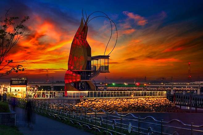 밤이 되면 다채로운 LED 조명의 빛에 따라 화려한 야경이 펼쳐집니다. 새우타워 광장에는 여러 조형물과 쉬어갈 수 있는 쉼터, 커피 한 잔의 여유를 만끽하는 카페, 산책로가 마련되어 있습니다.