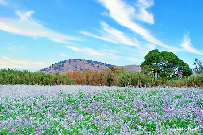 다랑쉬오름의 자락에 피어난 보랏빛 갯무꽃은 그 자체로 특별한 볼거리다. 한반도 전역에서도 좀처럼 보기 힘든 이 꽃은 제주에서도 극히 일부 지역에서만 군락을 이룬다. 연분홍빛이 섞인 갯무꽃이 초록 풀밭 위에 퍼져 있는 모습은 그야말로 이색적이다. 바람결에 따라 이리저리 흔들리는 그 자태는 마치 물결처럼 부드럽게 흘러간다.