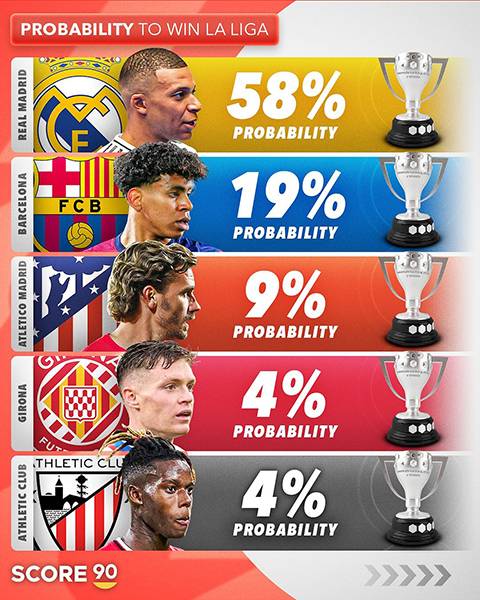 축구 콘텐츠 제작소 ‘score90’은 22일(한국시간) 베팅업체 ‘bookmakers’를 참고해 2024/25시즌 라리가 우승 확률을 공개했다.