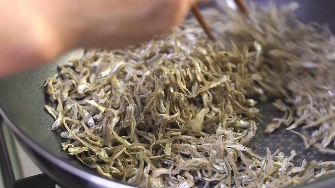 먼저 오목한 프라이팬 '중불'에서 멸치를 넣고 1~2분간 볶으세요. 그러면 비린맛과 수분을 제거할 수 있어요.