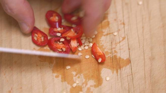 마늘은 편 썰기를 하고, 고추는 어슷하게 썰어서 씨앗을 제거한 후 사용하세요.