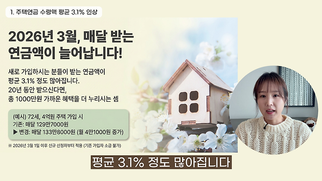 3월 1일부터 주택연금 산정 방식이 새롭게 바뀝니다. 새로 가입하는 사람이 받는 연금액은 평균 3.1% 많아집니다. 가령 72세 가입자가 4억원짜리 주택으로 가입하면 기존 월 129만7000원에서 약 4만1000원 늘어난 월 133만8000원을 받습니다. 20년 동안 수령할 경우 1000만원 가까이 더 받게 됩니다. 2026년 3월 1일 이후 신규 신청자부터 적용하며 기존 가입자는 소급 적용하지 않습니다.