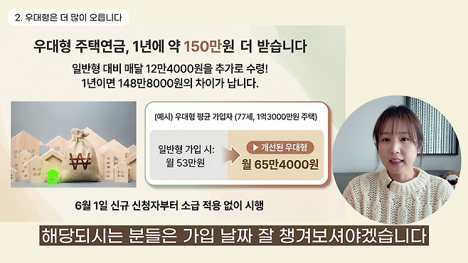 6월 1일부터 우대형 가입자는 일반형보다 월평균 12만4000원 정도를 더 받도록 개편합니다. 예를 들어 77세 어르신이 1억3000만원 주택으로 가입하면, 월 53만원에서 65만4000원까지 수령액이 늘어납니다. 역시 6월 1일 신규 신청자부터 적용합니다.