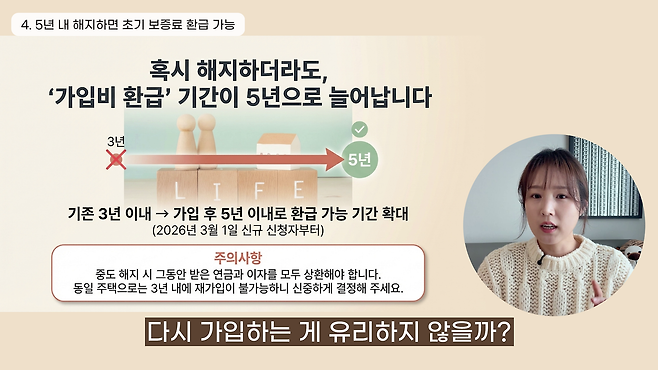 가입 후 불가피하게 해지할 때 초기 보증료를 돌려받는 기간도 늘어납니다. 3월 1일 신규 신청자부터 기존 3년에서 5년으로 환급 가능 기간을 연장합니다. 다만 중도 해지하면 받은 연금액과 이자를 모두 상환해야 하며 3년 동안 같은 주택으로 재가입할 수 없습니다.