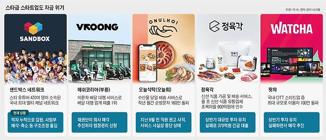 글로벌 경기 침체 속 스타트업 투자 시장이 얼어붙으면서 국내 ‘스타급’ 스타트업들마저 잇따라 한계 상황에 봉착해 구조조정과 회사 매각에 나서고 있다. 배달 대행 국내 1위인 메쉬코리아(서비스명 부릉)는 법정관리와 매각이 동시에 추진되고 있고 토종 OTT(온라인 동영상 서비스) 왓챠도 긴급 자금 수혈 후 대기업을 상대로 매각 의사를 타진 중이다. 투자 업계 돈줄이 마르면서 덩치 작은 스타트업들이 줄줄이 쓰러진 데 이어 최근엔 업계 간판 자리를 굳건히 지켰던 스타트업들도 투자금 조달 실패와 적자 폭증에 백기를 들기 시작한 것이다. 스타트업에 투자하는 정부의 모태펀드조차 내년 예산을 올해보다 40% 축소한 상황이라 내년엔 스타트업 업계 한파가 훨씬 거셀 것이라는 전망이 나온다.