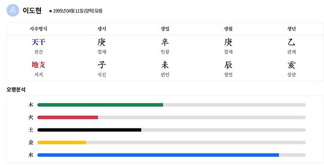 본 내용은 포털 등 미디어상에 공개된 스타들의 생년월일을 기반으로 사주명리학에 의거한 결과입니다.